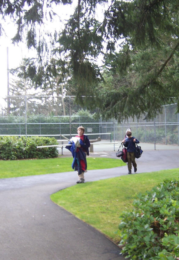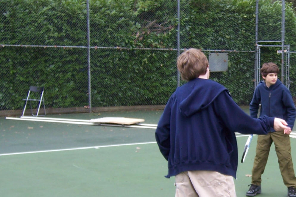 The boys shoot the film on a local tennis courts. The day's light rain, while not ideal for filming, keeps other court users away.