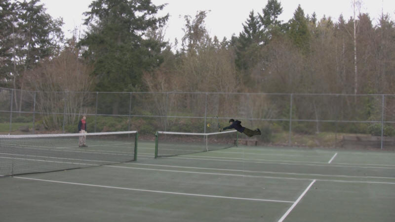 The laws of physics are nothing compared with the imagination of Bellevue filmmaker Ben Kadie, a seventh-grade student at Seattle Country Day School. Young Kadie's dazzling "A Friendly Game" is the ironic title of a tale about a tennis match that defies gravity and concludes with a ball banking furiously off trees and a few foreheads. Production stills reveal Kadie's homemade dolly (using a re-purposed skateboard) and a giant sheet of green fabric (hanging from his family's deck), against which special effects were shot. The resourceful Kadie (a winner of last year's Three-Minute Masterpiece contest as well) says he used real tennis balls during the shoot as well as an "animated, spinning tennis ball I added during editing."
